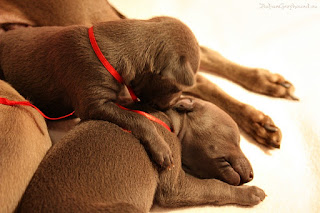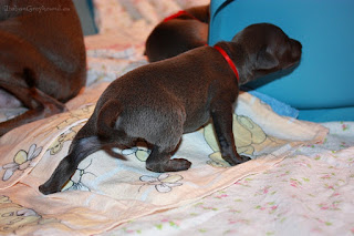Puppies are doing longer intervals between meals and Abi decided to start teaching babies to be self reliant - she goes outside the whelping box between feeding the puppies.