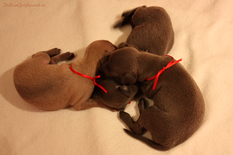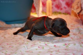 Puppies gain weight very fast. The biggest one is the third girl. Girls were very calm today when we did exercises with them. It was a second time and they have already accepted this new situation. Good omen! We also tried to take some photos - but it was Mission Impossible. We finally got only one sharp image.