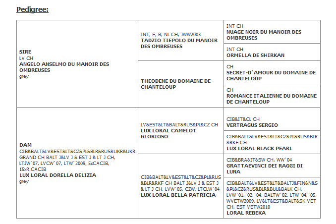 | Marcello is a very elegant and strong boy with beautiful body. His color is deep blue. Marcello has nice character, very polite and is very confident. He has just outstanding pedigree! | XUXA is a small/medium sized, delicate female with beautiful curves. Has deep chest, excellent angulation, elegant head with big, roundish eyes, long neck, beautiful movement. She has very energetic temperament and is very friendly to strangers. |